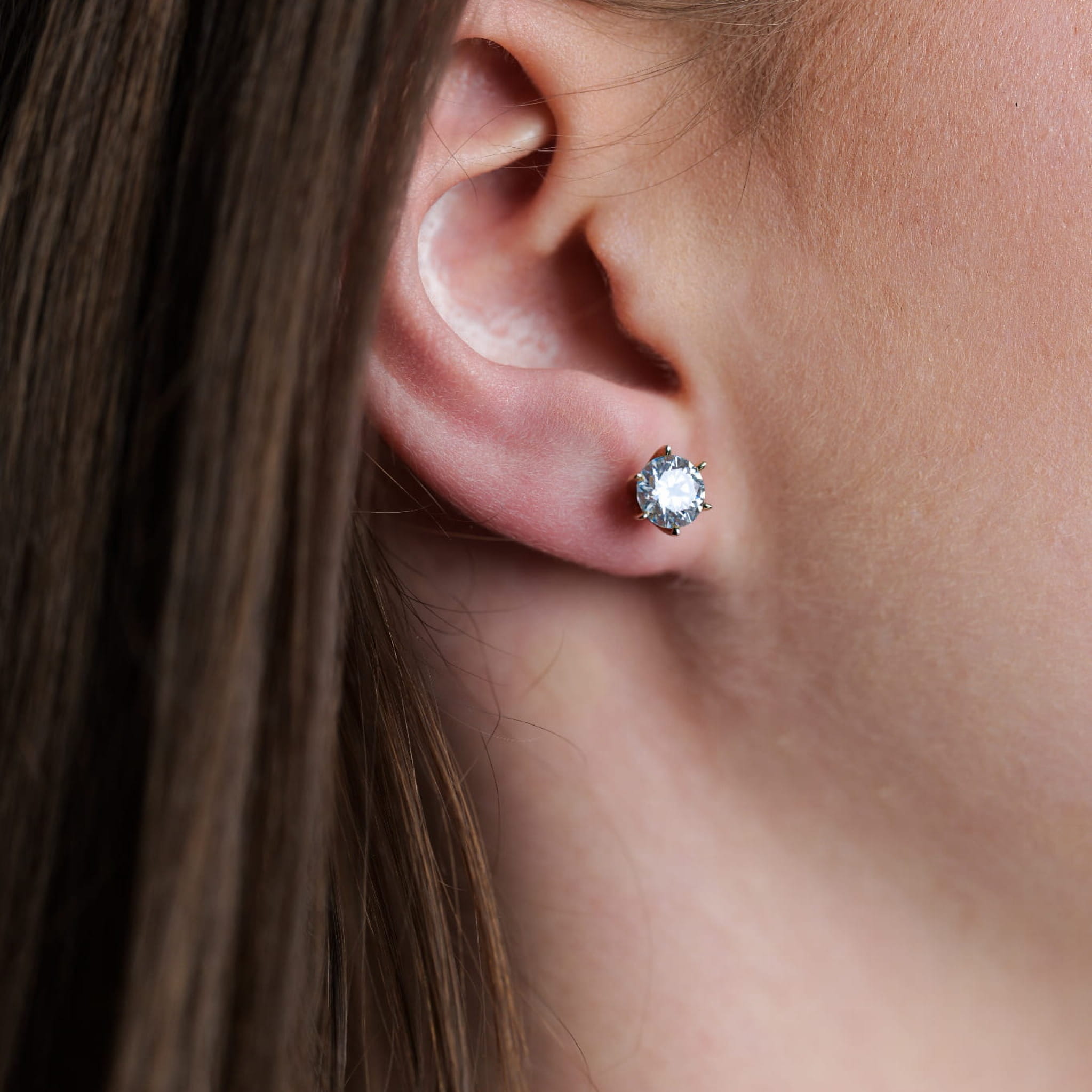 Kolczyki wykonane są z żółtego złota 585, a ich masa wynosi około 1,80 g. Każdy kamień ma średnicę około 6,00 mm i masę 0,80 ct, co łącznie daje 1,60 ct moissanitów VS1/E.