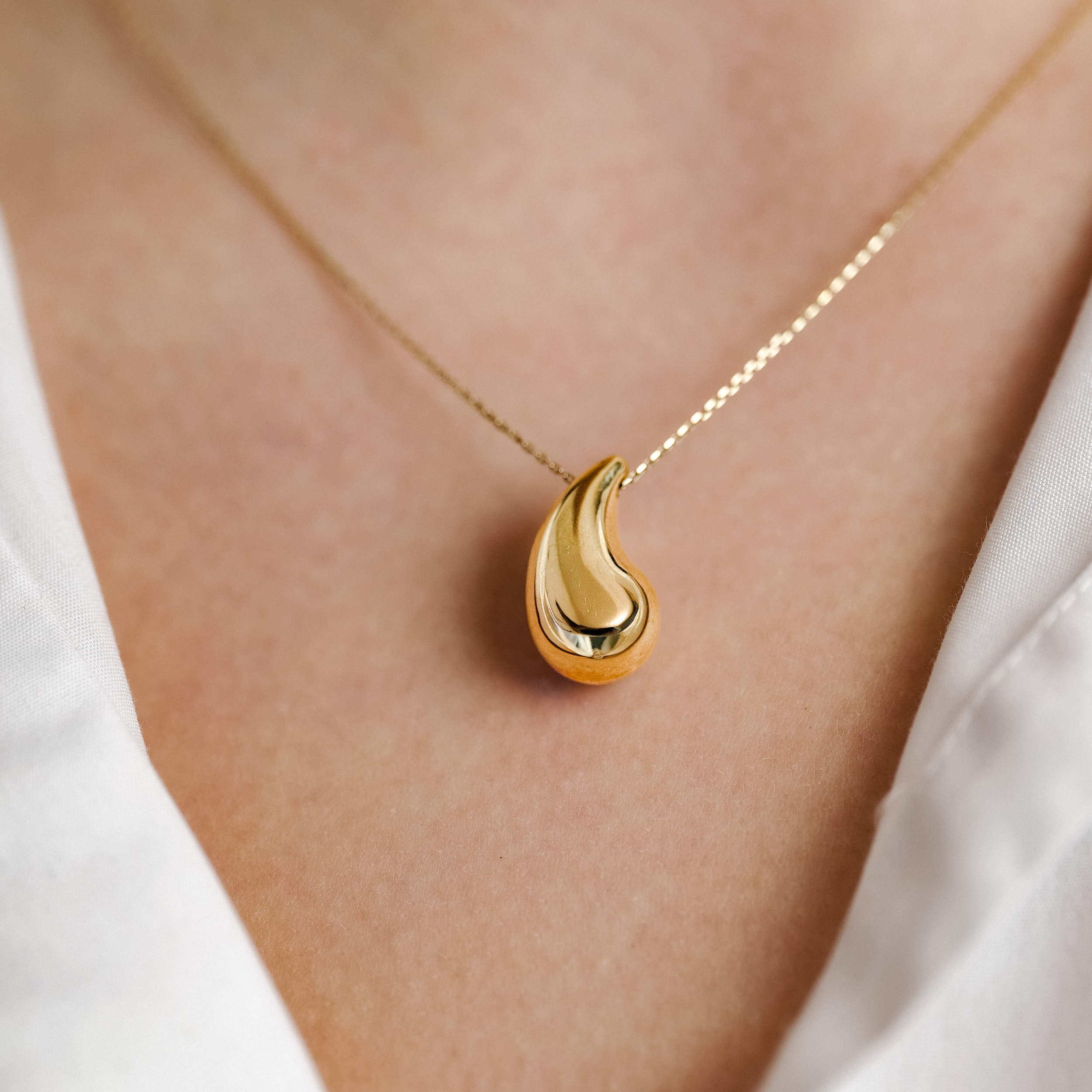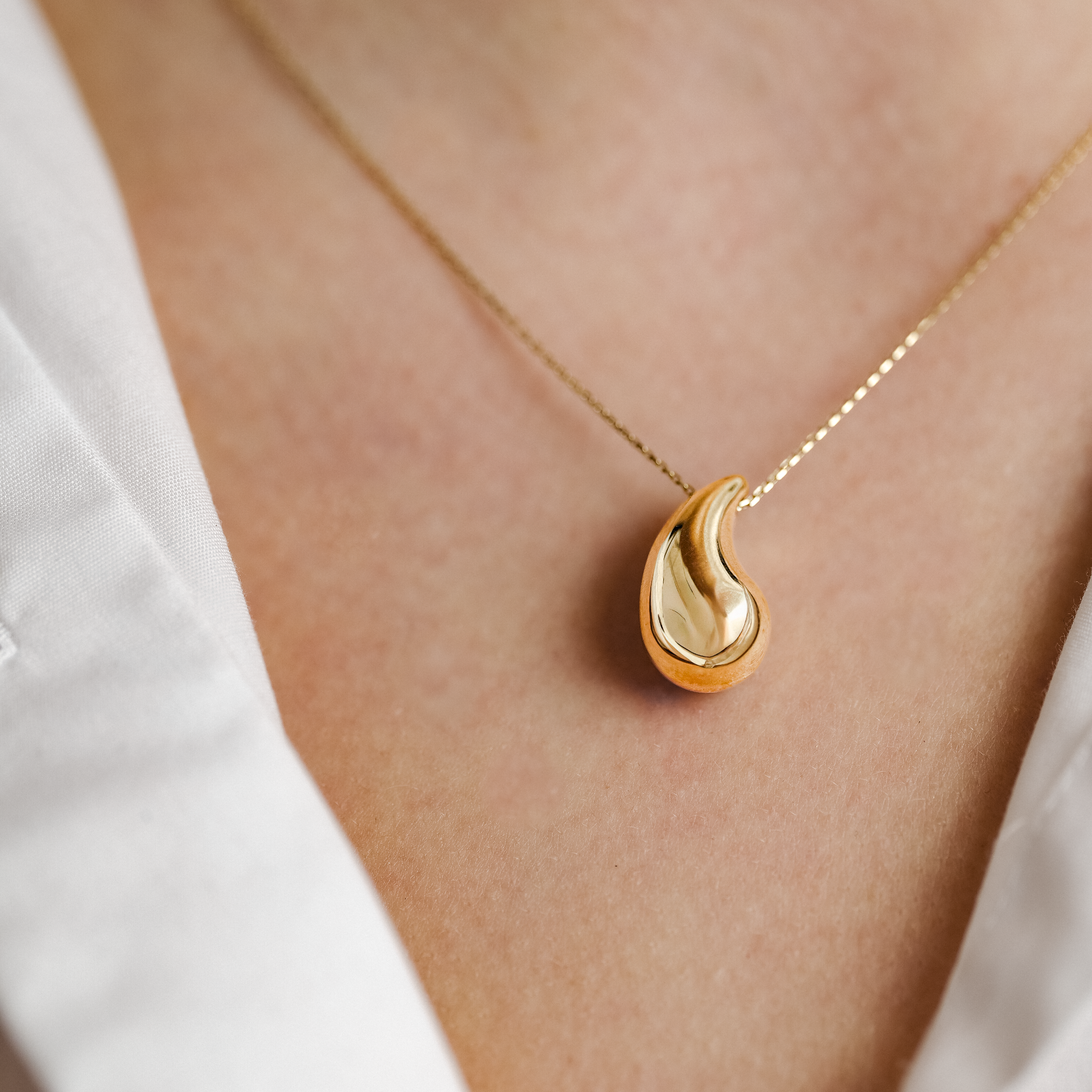 Elegancki naszyjnik wykonany z żółtego złota próby 585 (14K), wyposażony w delikatną zawieszkę w kształcie łezki. Klasyczna forma oraz możliwość regulacji długości łańcuszka sprawiają, że biżuteria doskonale dopasowuje się do stylizacji i sylwetki.