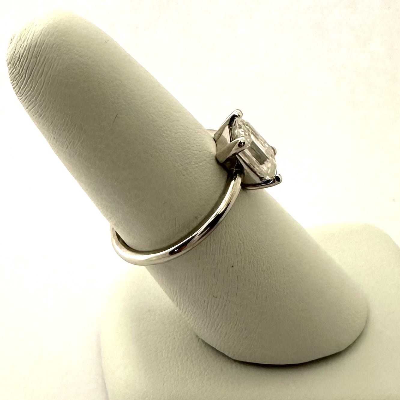 W pierścionku oprawiono moissanit o minimalnych parametrach VS1/E, co oznacza kamień o wysokiej przejrzystości, pozbawiony widocznych inkluzji i o pięknej, jasnej barwie. Szlif emerald podkreśla liniowy blask kamienia i jego elegancką, luksusową formę, a 2,00 ct tworzy efekt imponującej, ale nadal wyważonej biżuteryjnej obecności.
