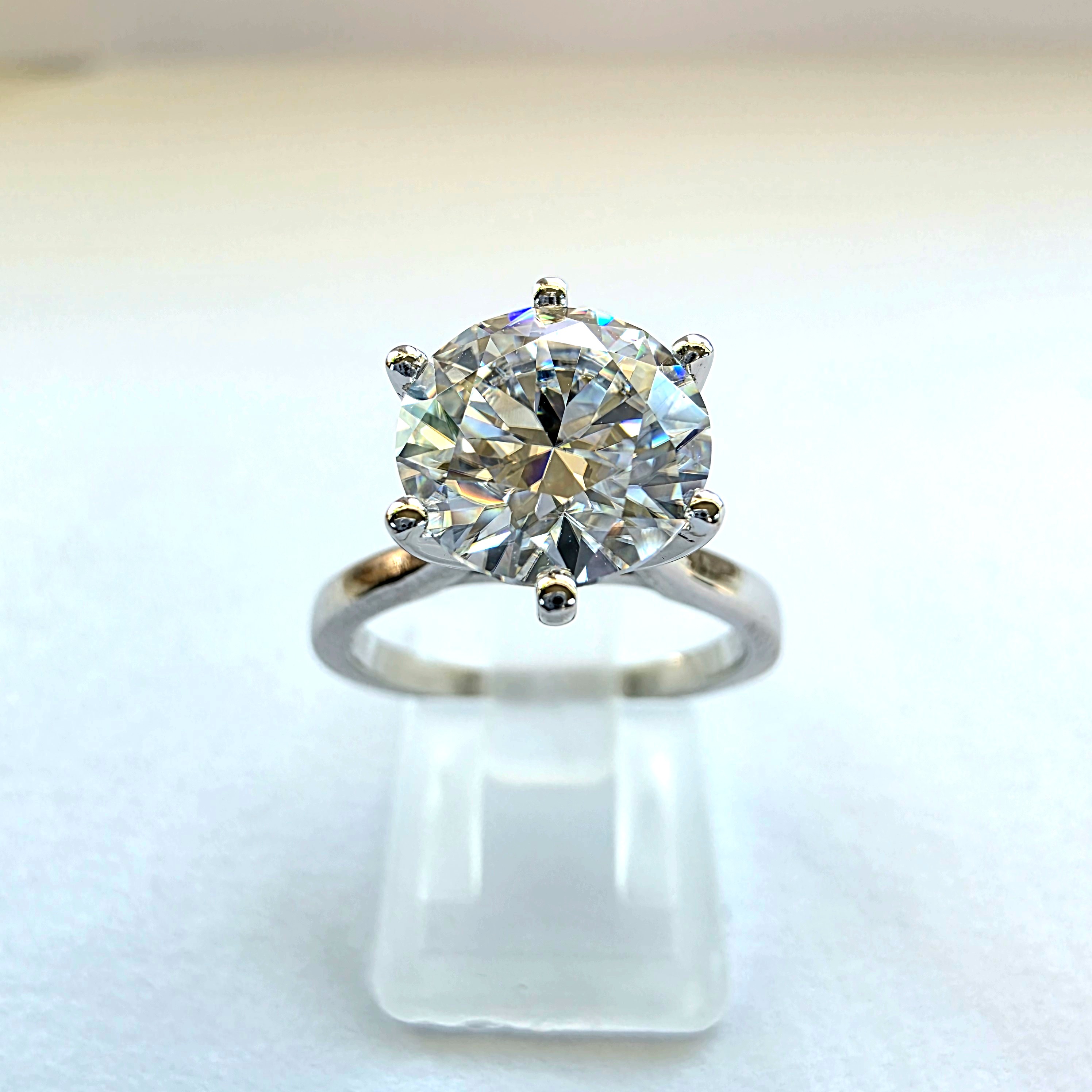 Całość wykonano z białego złota próby 585, a masa produktu wynosi około 4,0 g. Centralny kamień to okrągły moissanit o średnicy 9,0 mm, odpowiadający masie około 3,00 ct. To jeden z najbardziej efektownych modeli w kolekcji — duży, mocny wizualnie i niezwykle elegancki.
