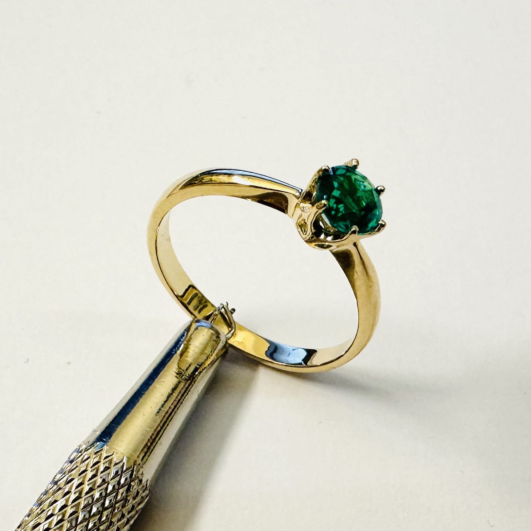 Pierścionek wykonano z żółtego złota próby 585, o masie około 2,00 g. Centralnym elementem jest szmaragd o masie 0,50 ct i średnicy około 5,00 mm, osadzony w klasycznym szlifie brylantowym okrągłym, który podkreśla elegancję całości.