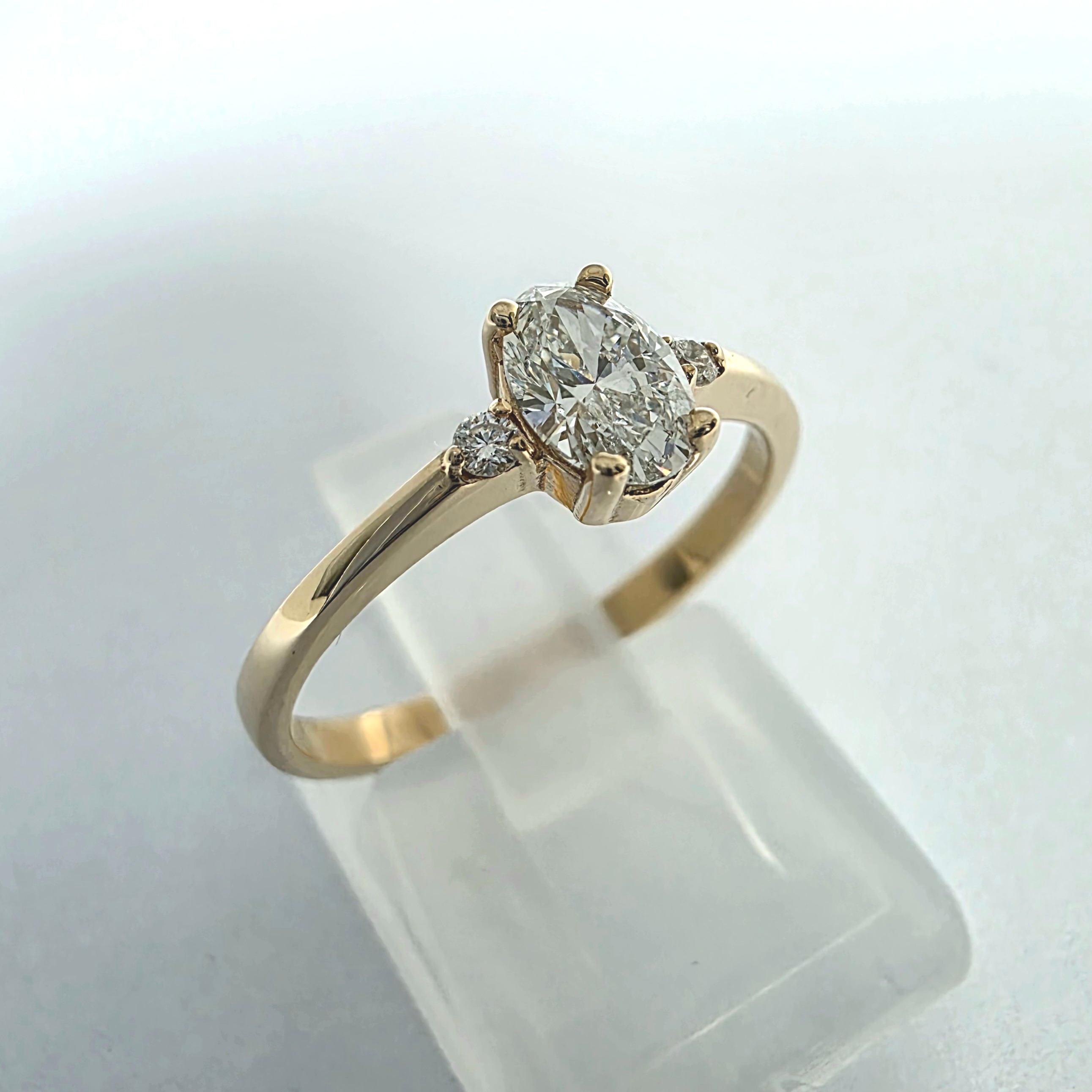Masa pierścionka wynosi około 1,60 g, a całość wykonana jest z żółtego złota próby 585. Kamień centralny to owalny moissanit 0,45 ct o wymiarach 6 × 4 mm, uzupełniony dwoma naturalnymi brylantami o łącznej masie 0,03 ct. Oprawa i konstrukcja są starannie dopracowane, zapewniając trwałość oraz perfekcyjny wygląd na dłoni.