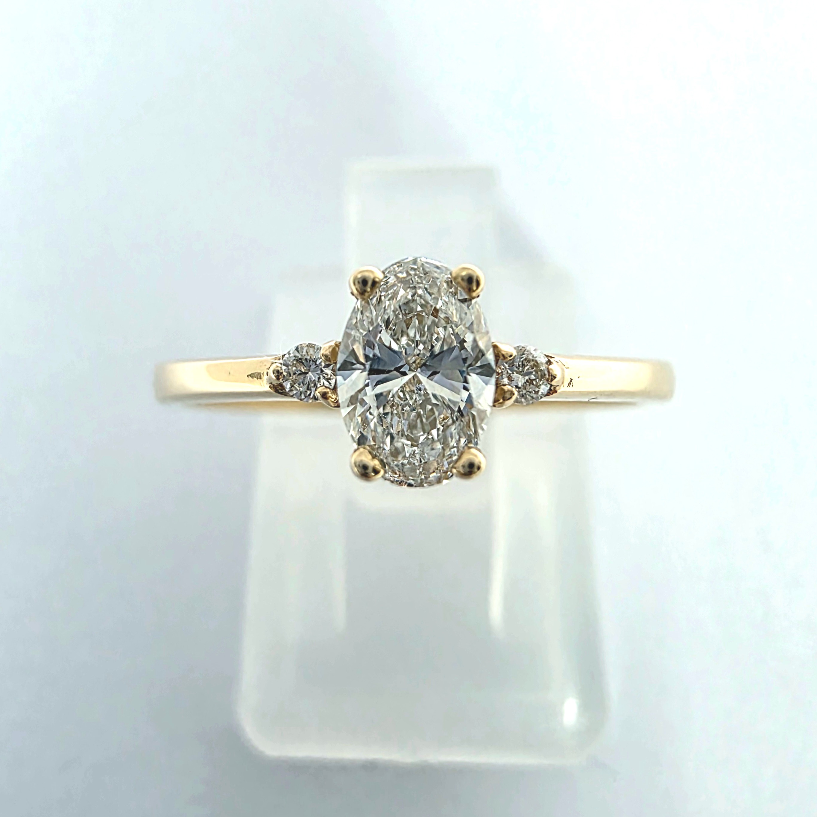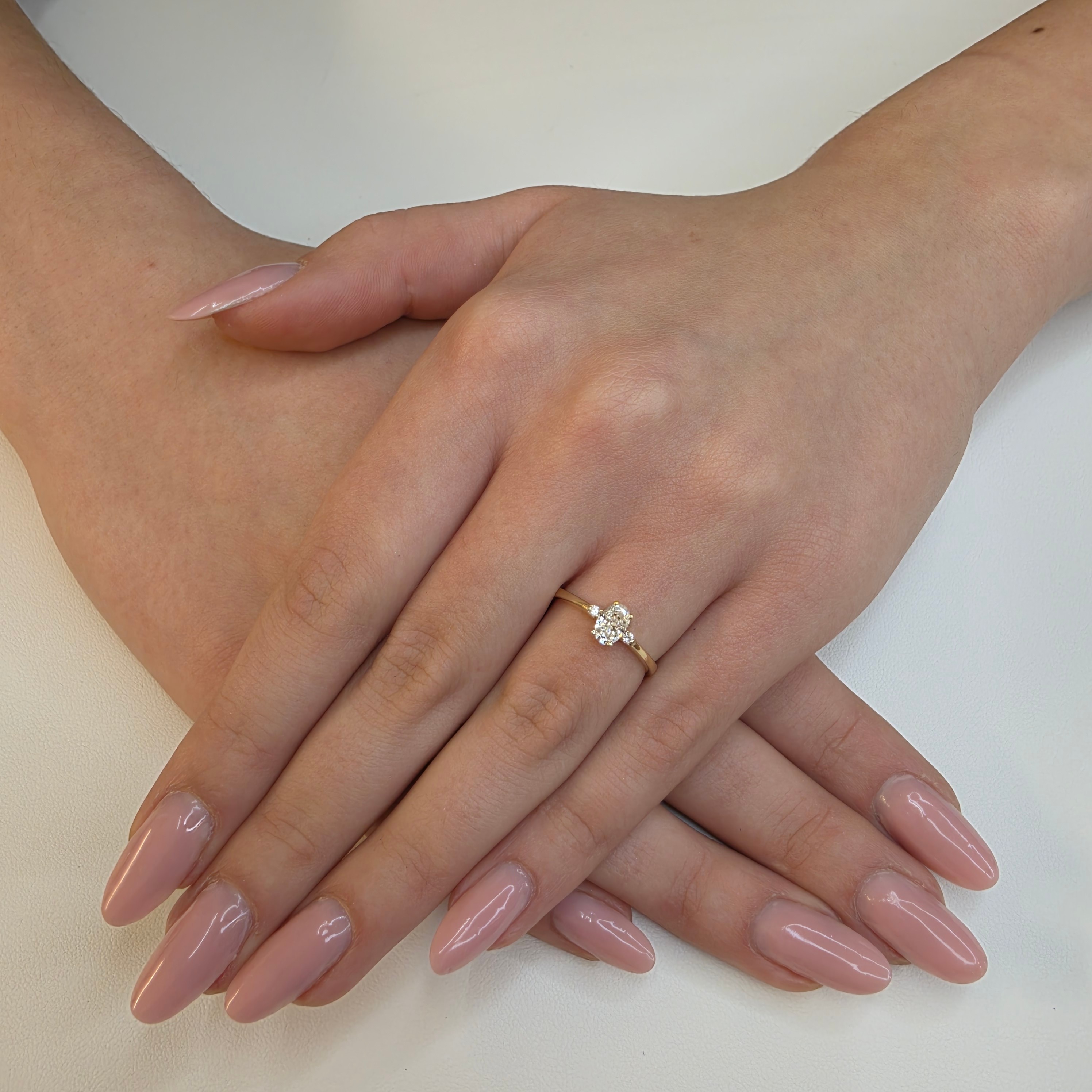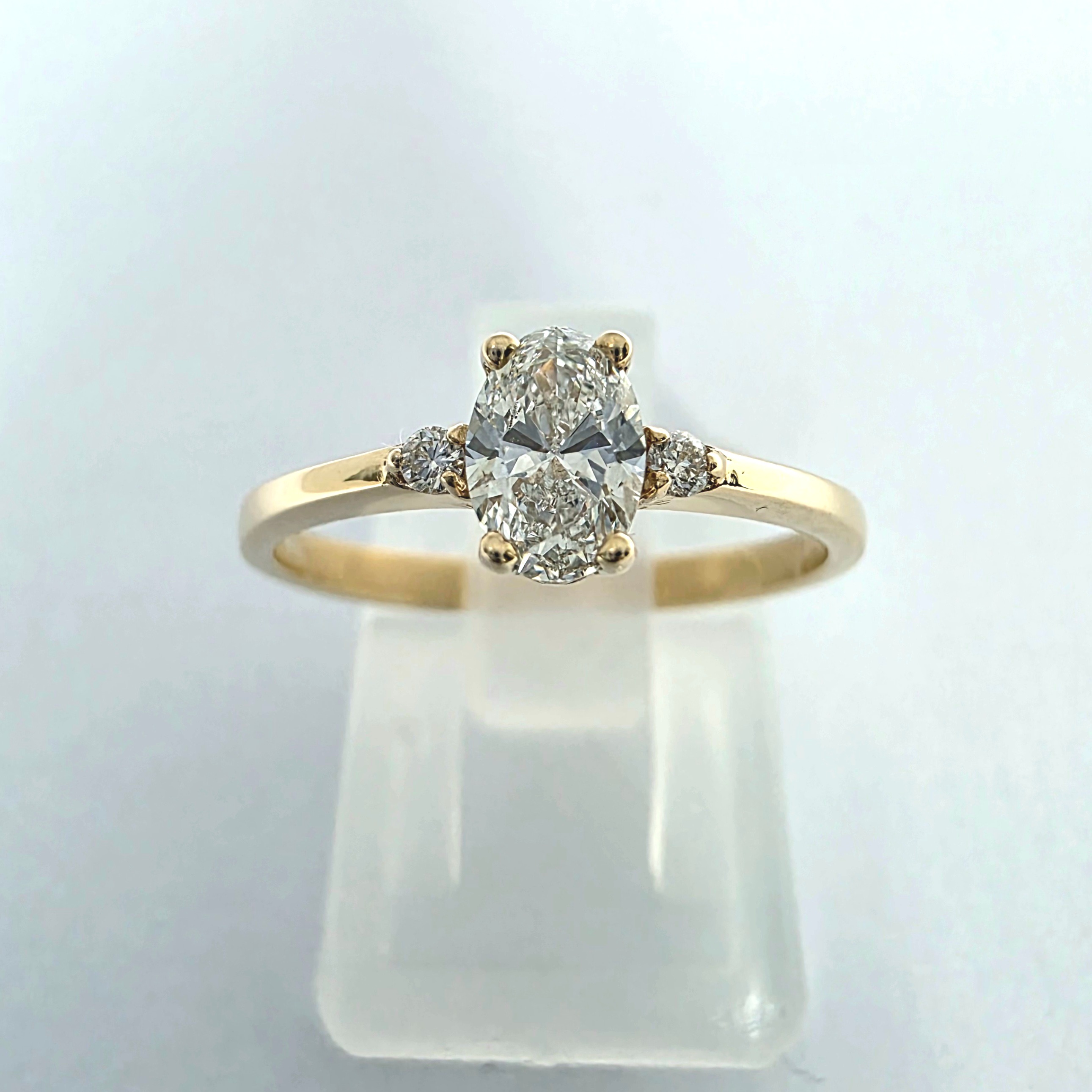 Klasyczny i niezwykle elegancki pierścionek wykonany z żółtego złota 585 (14K), w którym centralne miejsce zajmuje owalny moissanit VS1/E 0,45 ct o wymiarach 6 × 4 mm. Po jego bokach osadzone zostały dwa naturalne diamenty VS1/E o średnicy ok. 1,50 mm i łącznej masie 0,03 ct. To bestsellerowy model, ceniony za idealną harmonię między klasyką, subtelnym blaskiem i wyrafinowanymi proporcjami.