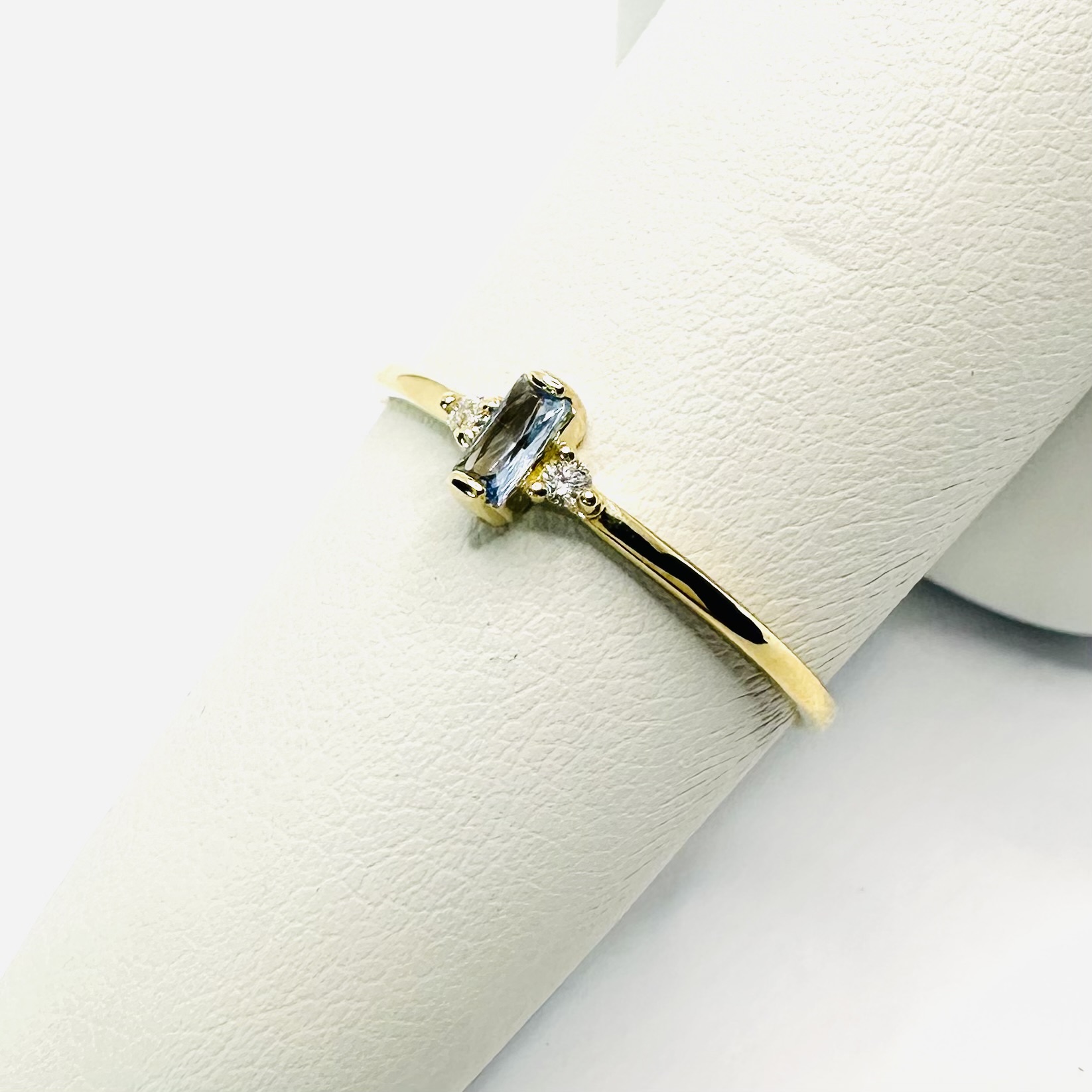 Centralnie osadzono naturalny akwamaryn w szlifie szmaragdowym (emerald), o wymiarach około 4 × 2 mm. Po bokach umieszczono dwa drobne naturalne diamenty brylantowe o średnicy około 1,50 mm, które razem ważą około 0,03 ct.