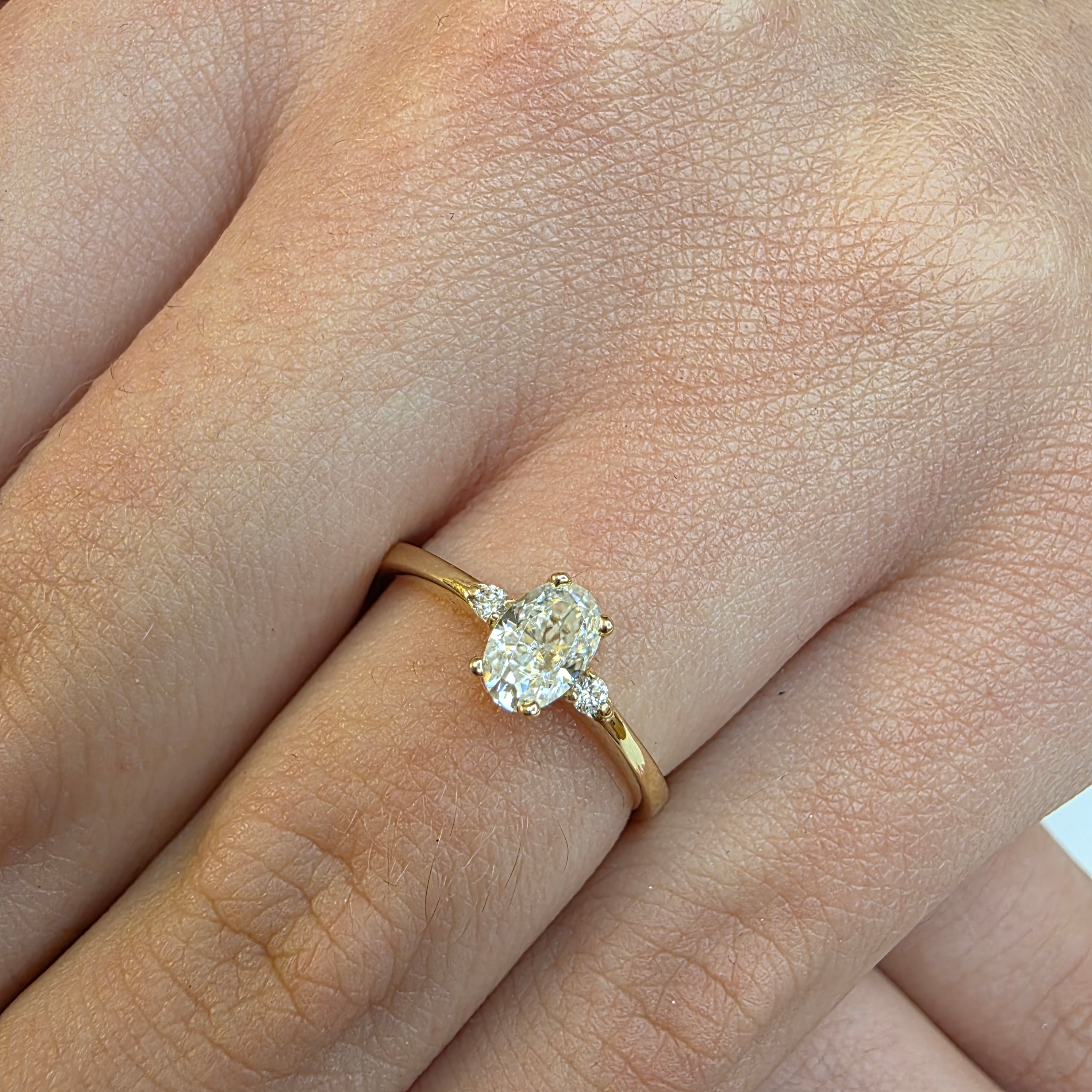 Wymiary kamieni: dwa brylanty ok. 1,50 mm oraz owalny kamień ok. 6 × 4 mm. Zestawienie różnych wielkości kamieni tworzy elegancki i harmonijny układ.