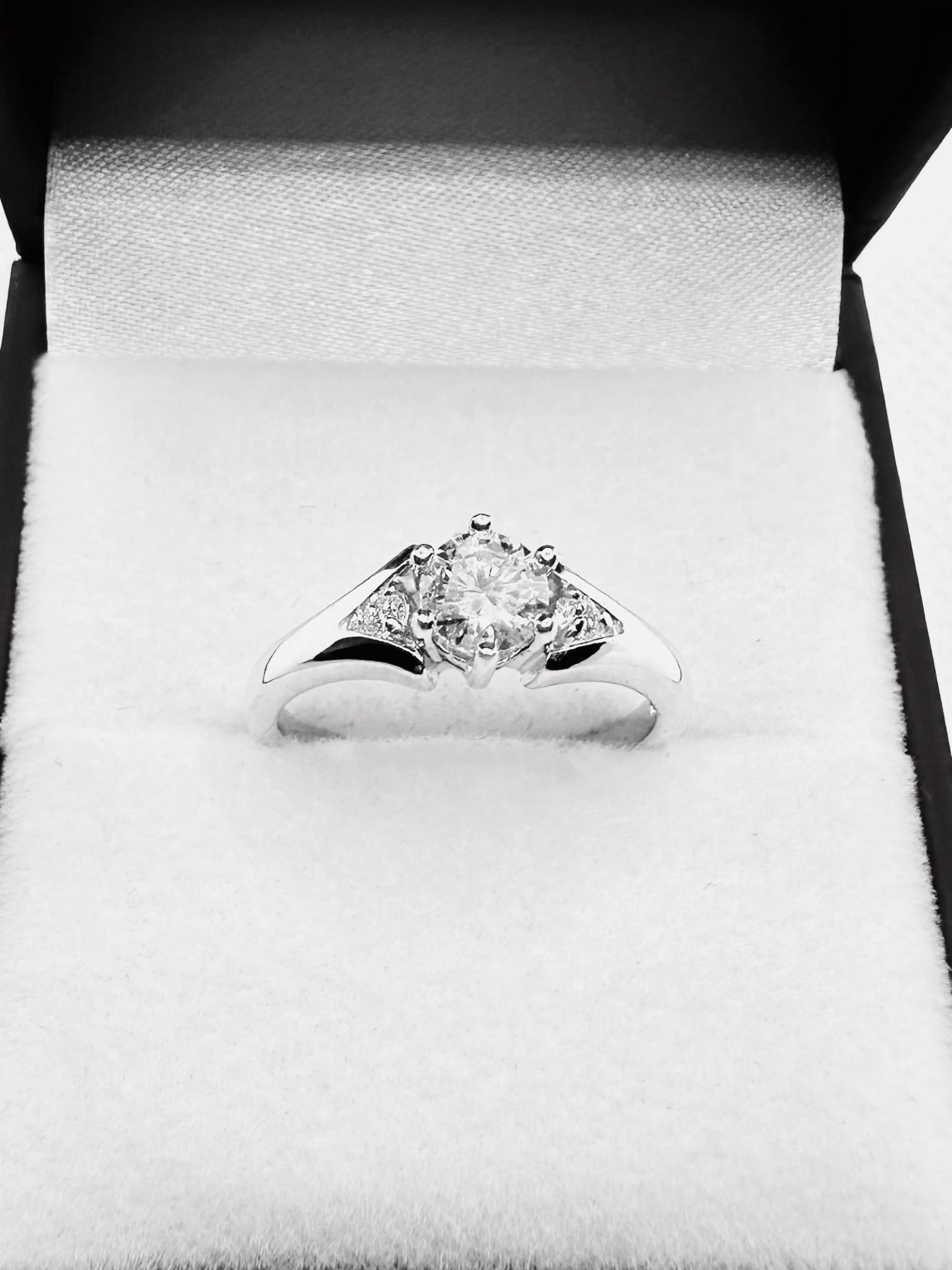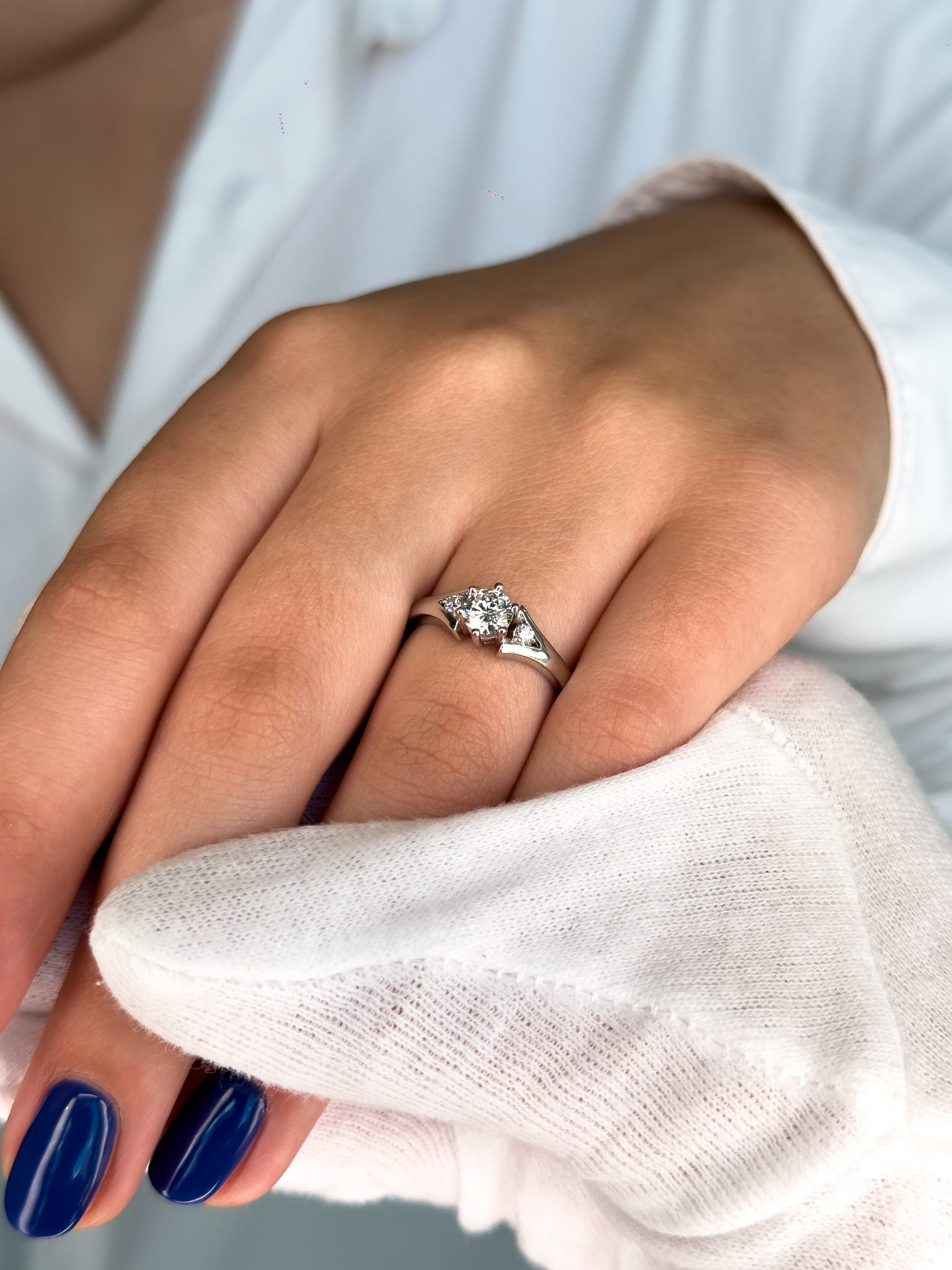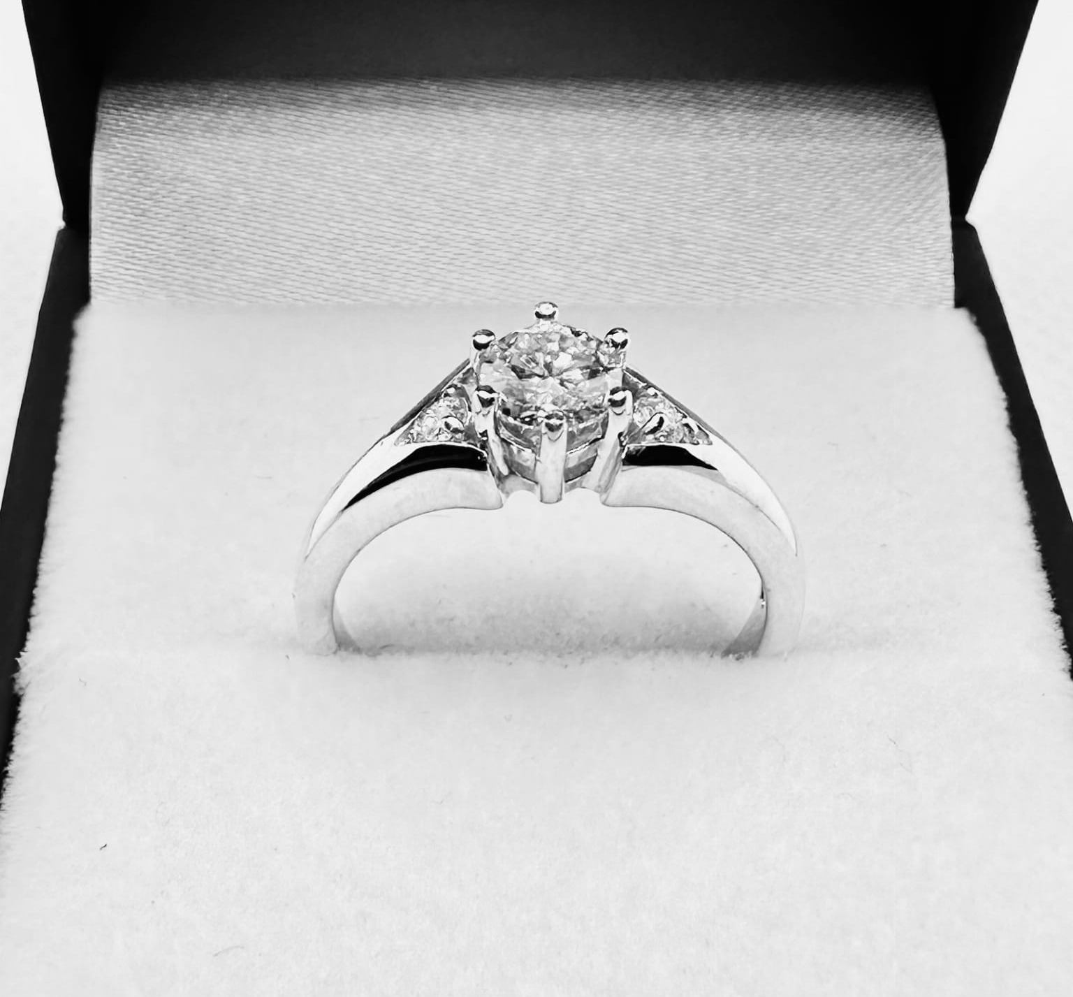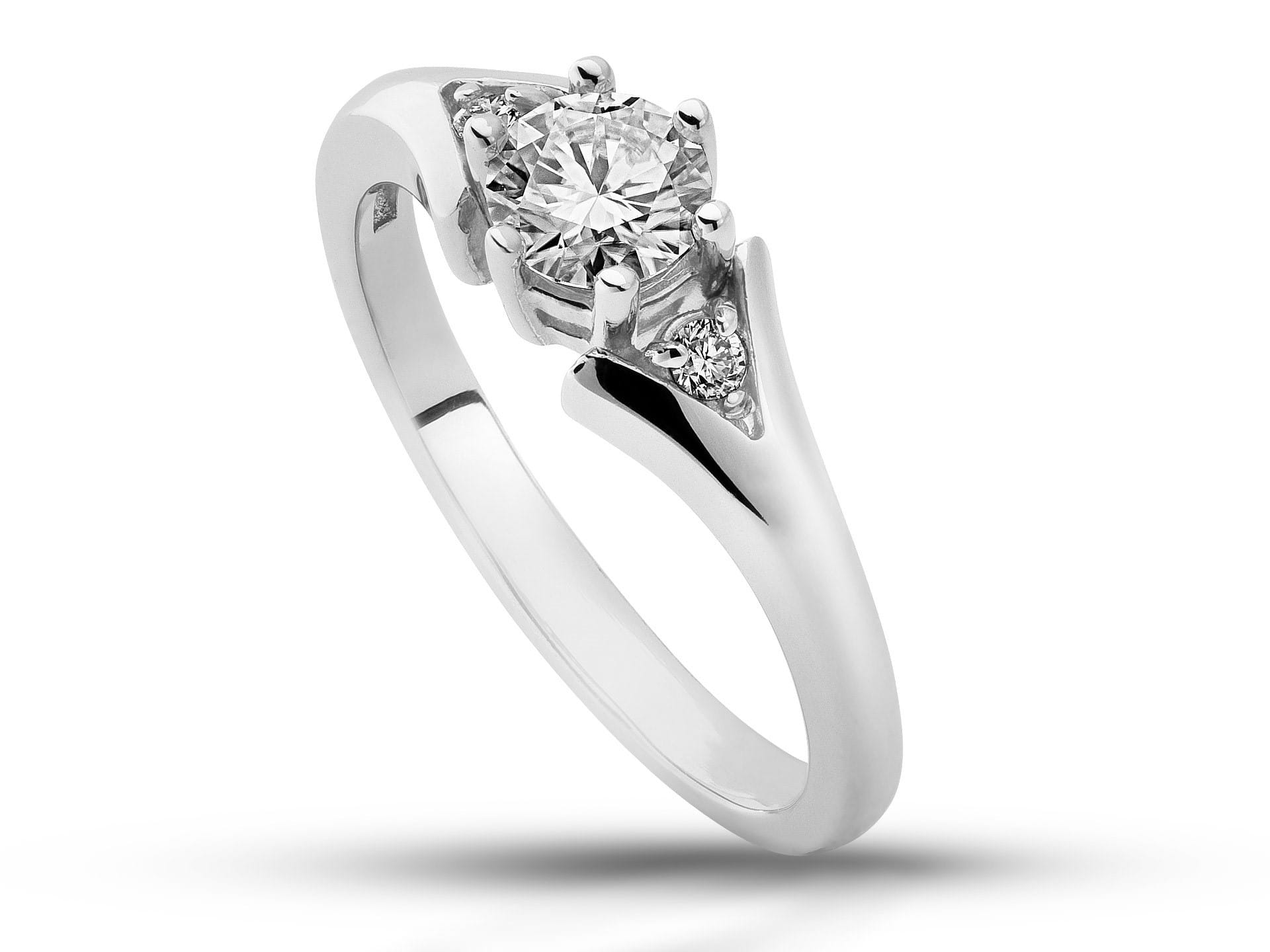 Klasyczny pierścionek wykonany z białego złota 585 (14K), ozdobiony imponującym diamentem laboratoryjnym o masie ok. 0,50 ct (średnica ok. 5,0 mm) oraz dwoma laboratoryjnymi brylantami o łącznej masie ok. 0,08 ct (po ok. 2,10 mm każdy), subtelnie wkomponowanymi przy koronie. W tym modelu stosujemy minimalne parametry: lab VS1/E, natomiast boczne brylanty posiadają parametry VS2/G. To elegancki, ponadczasowy wzór idealny na zaręczyny, ale także jako luksusowy prezent dla siebie.
