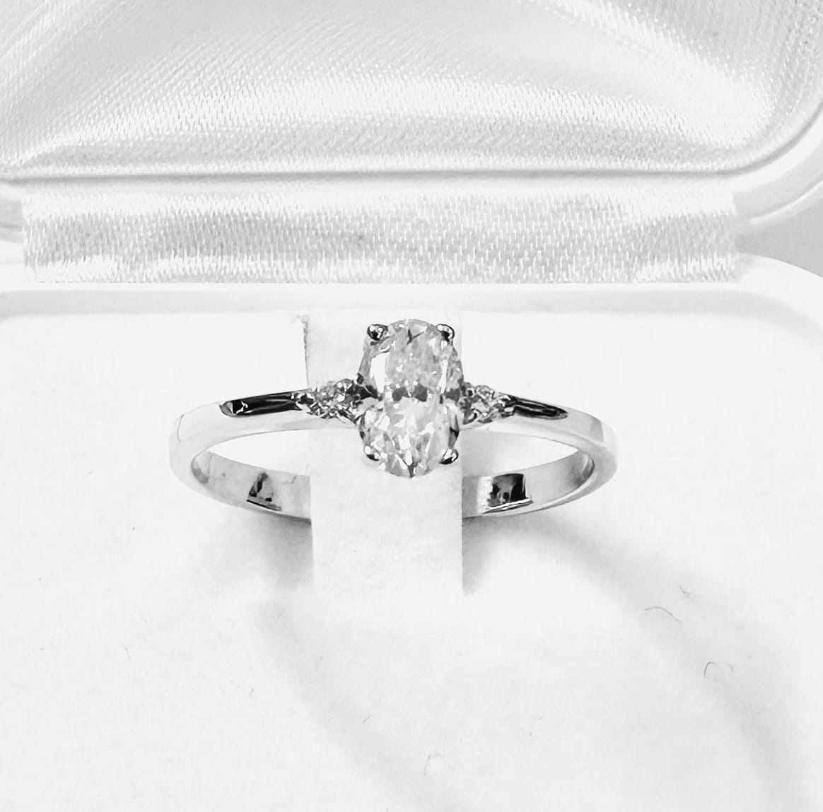 Połączenie owalnego kamienia z drobnymi brylantami tworzy klasyczną, elegancką kompozycję. Pierścionek pięknie odbija światło, pozostając jednocześnie delikatny i dyskretny.