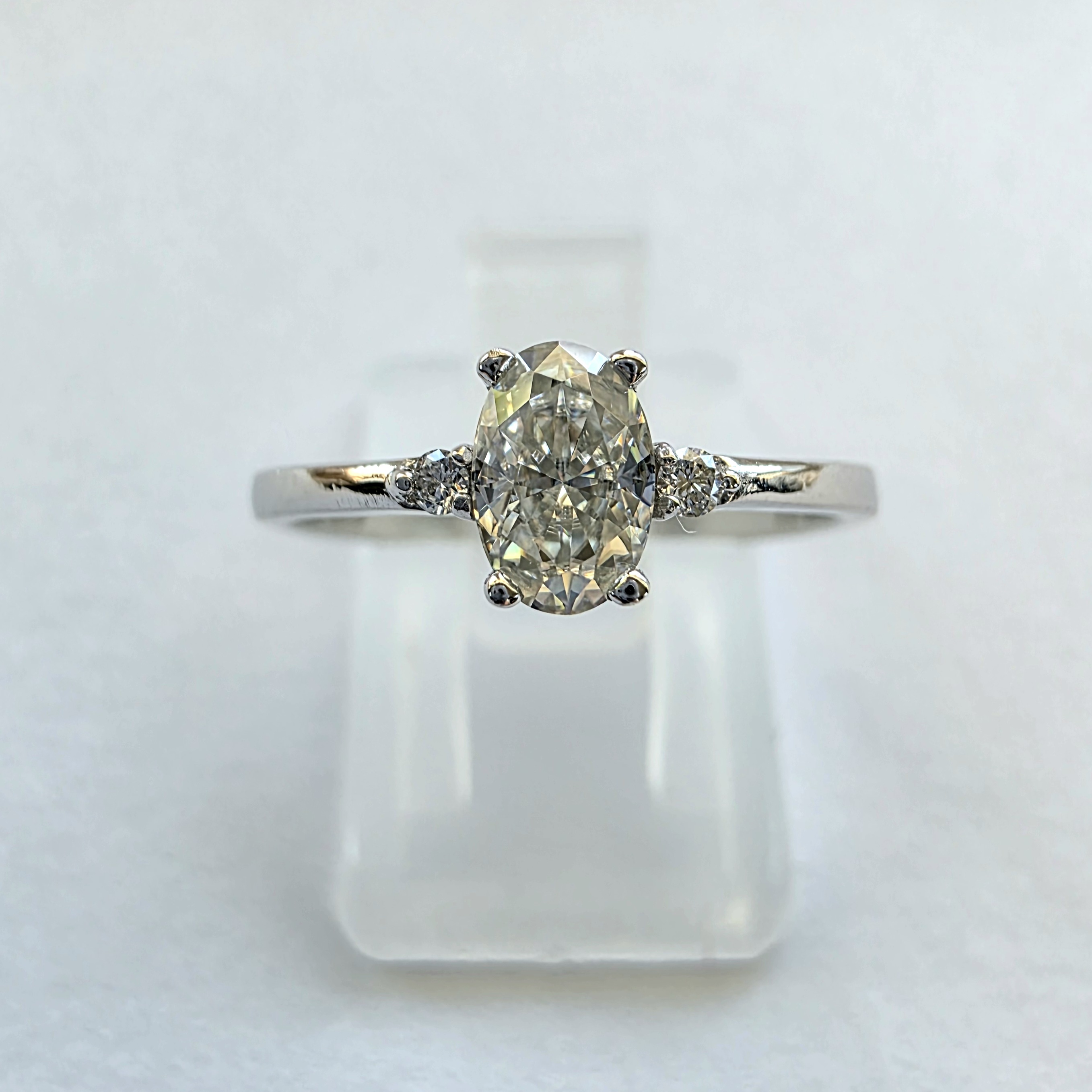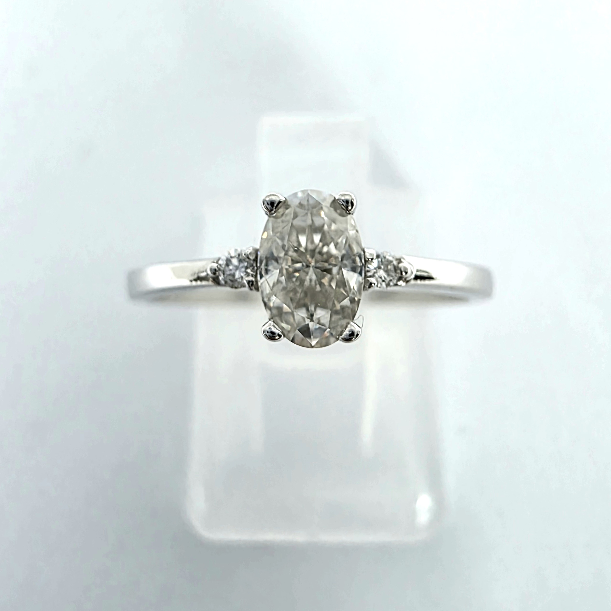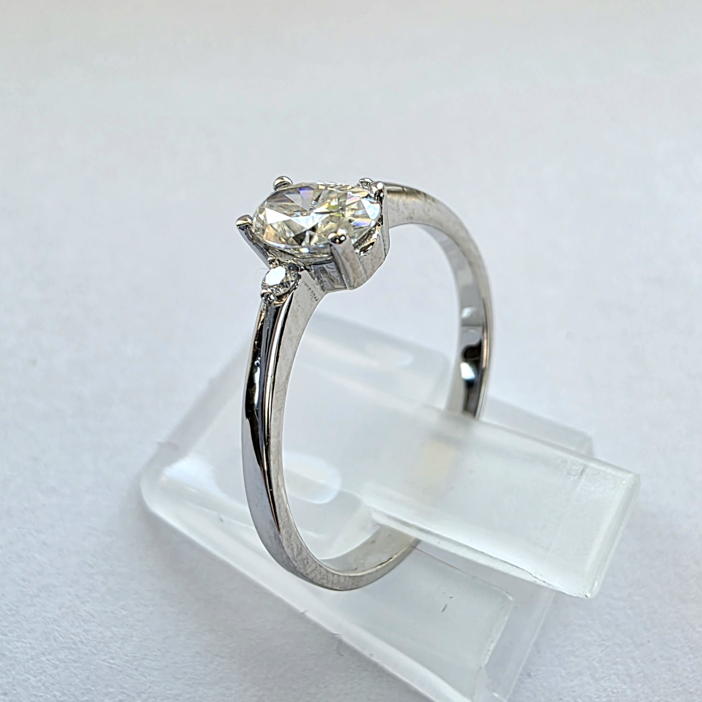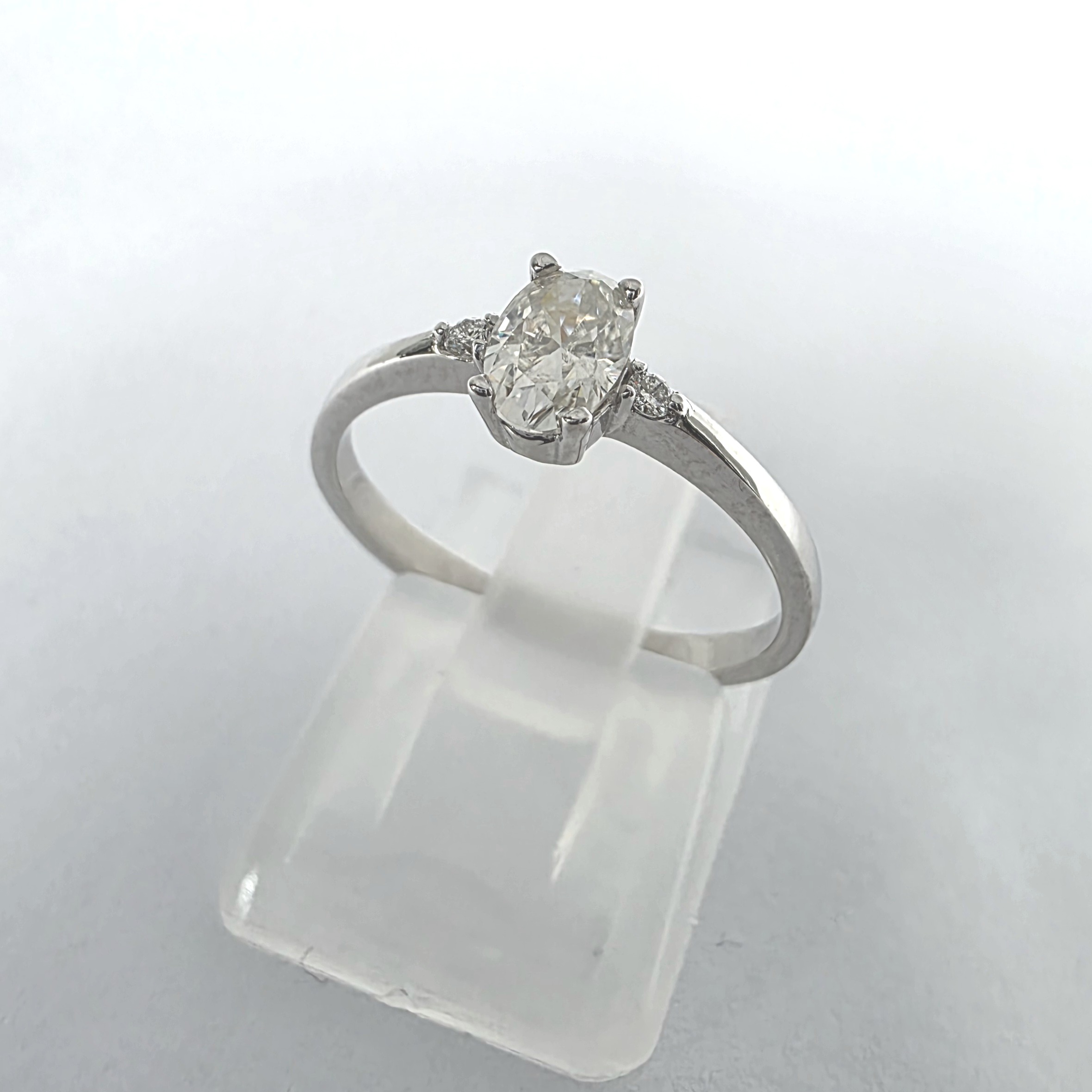 Wymiary kamieni: dwa brylanty o średnicy ok. 1,50 mm oraz owalny kamień o wymiarach około 6 × 4 mm. Zestawienie różnych wielkości kamieni podkreśla proporcje pierścionka i jego subtelny charakter.