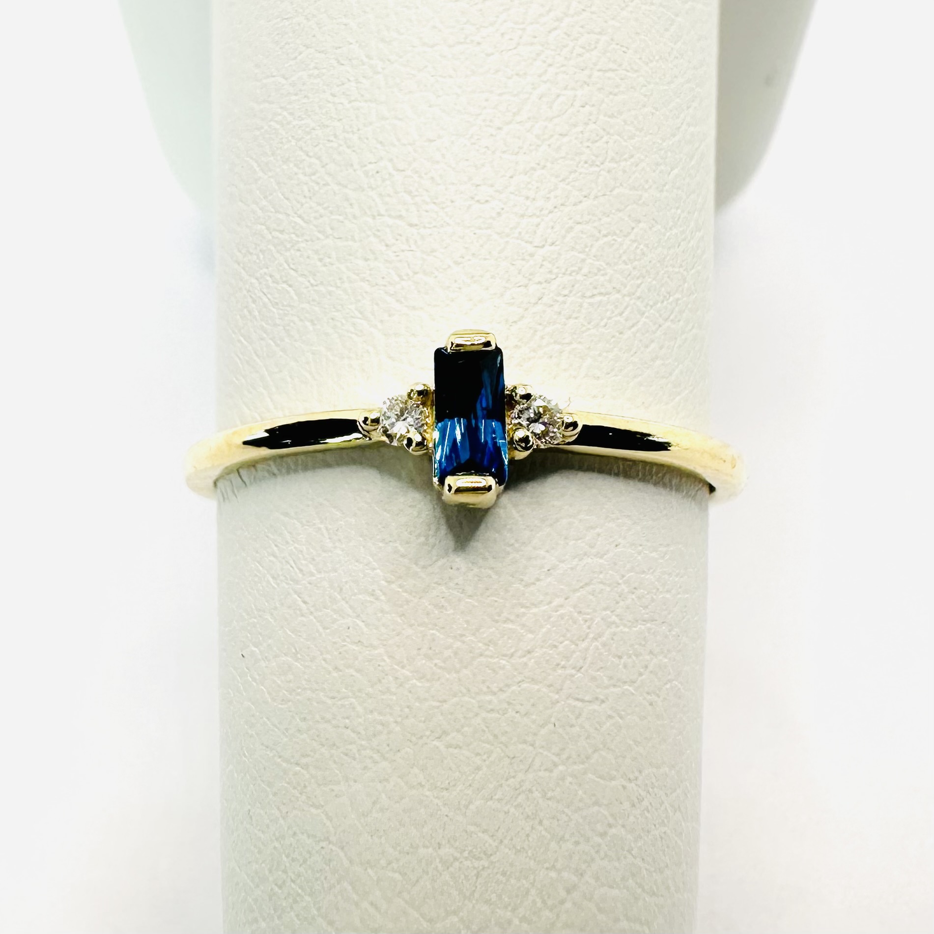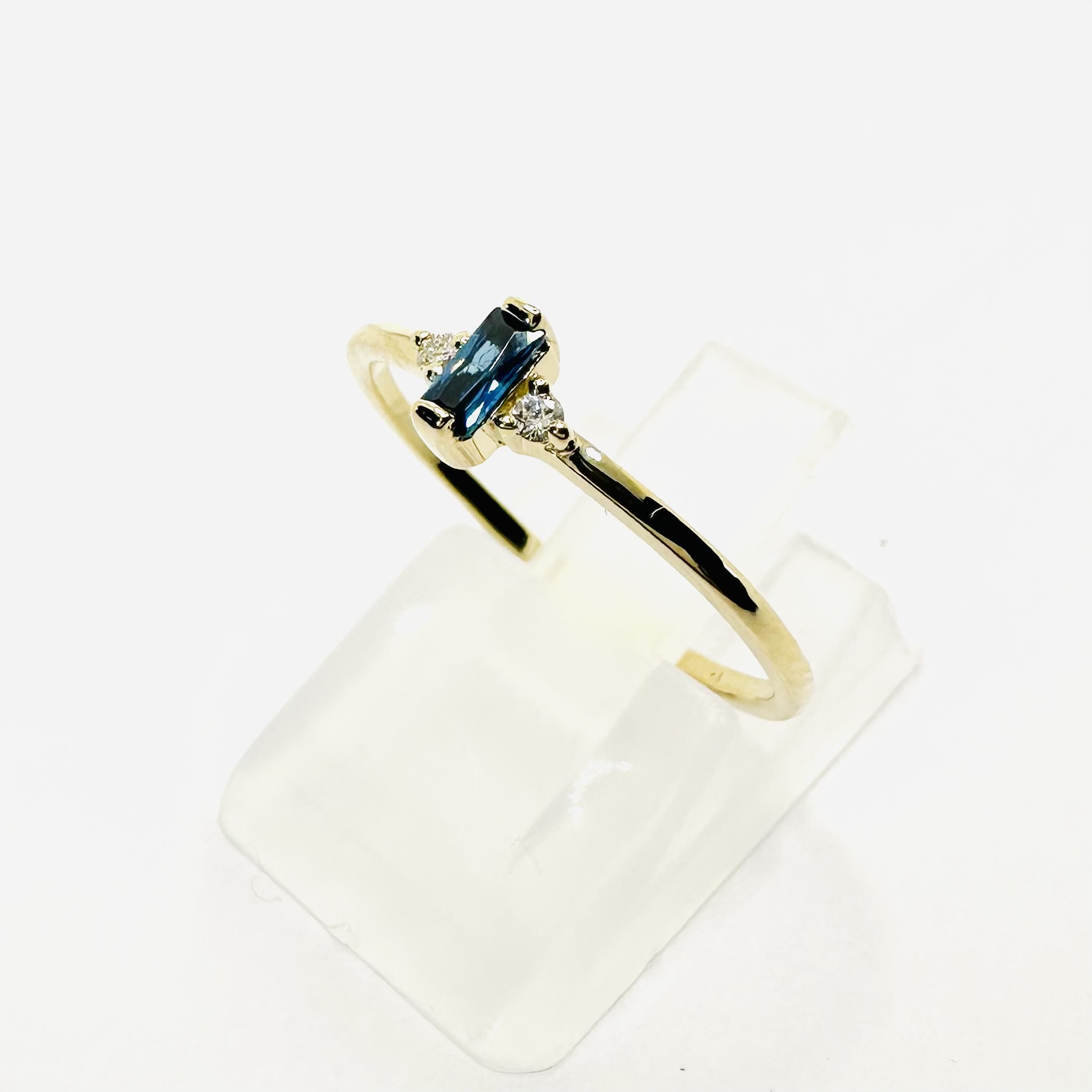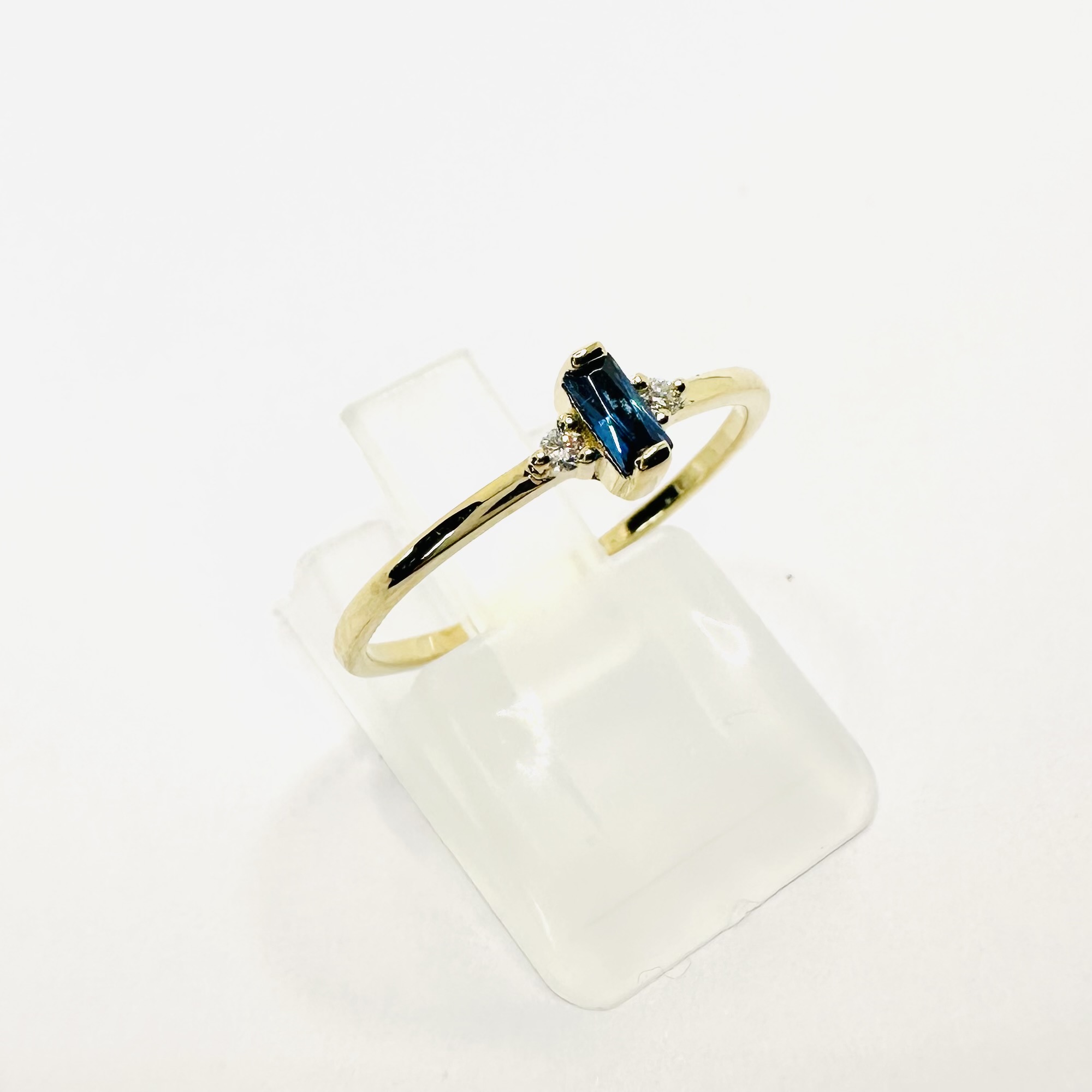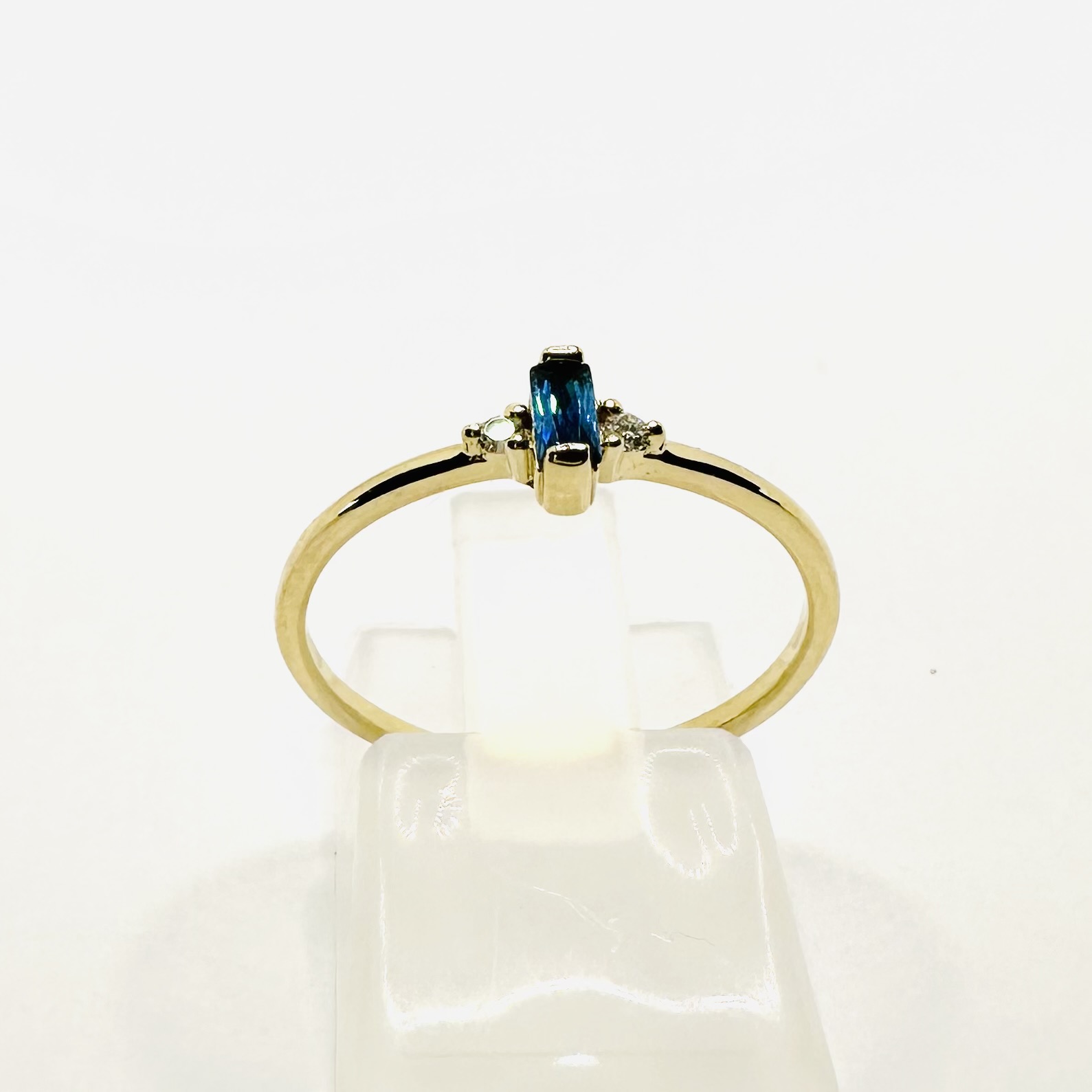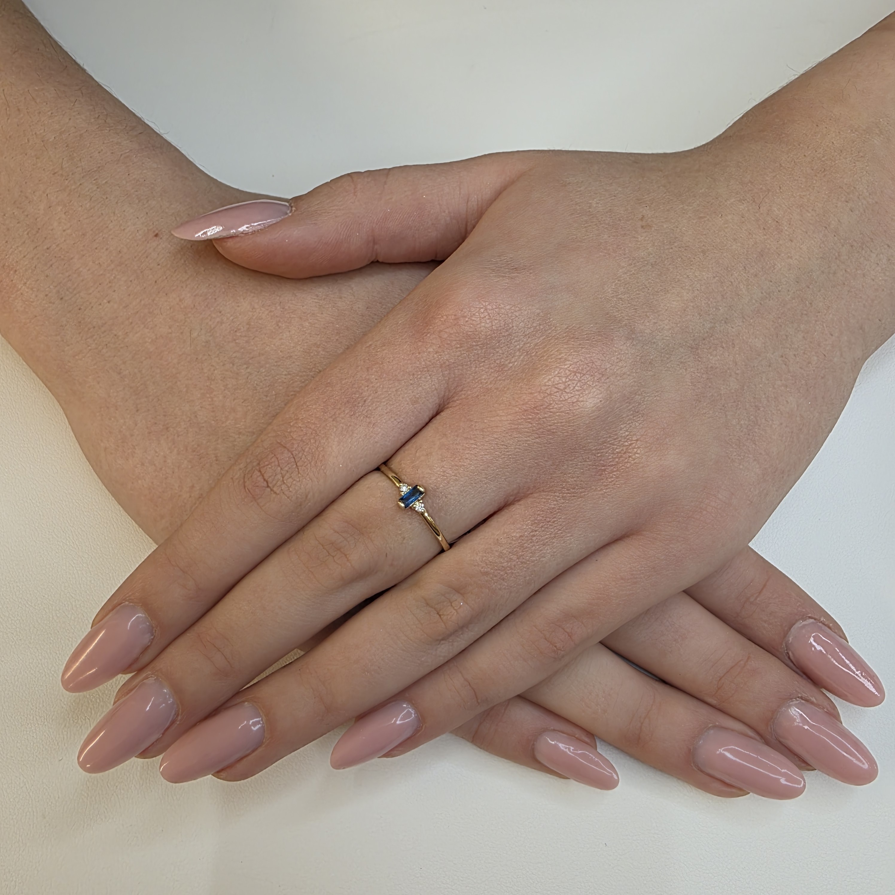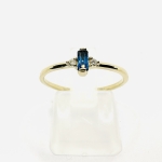 Centralnie oprawiono naturalny szafir w szlifie szmaragdowym (emerald cut), o wymiarach około 4 × 2 mm. Po bokach znajdują się dwa drobne naturalne diamenty brylantowe o średnicy około 1,50 mm, o łącznej masie około 0,03 ct.