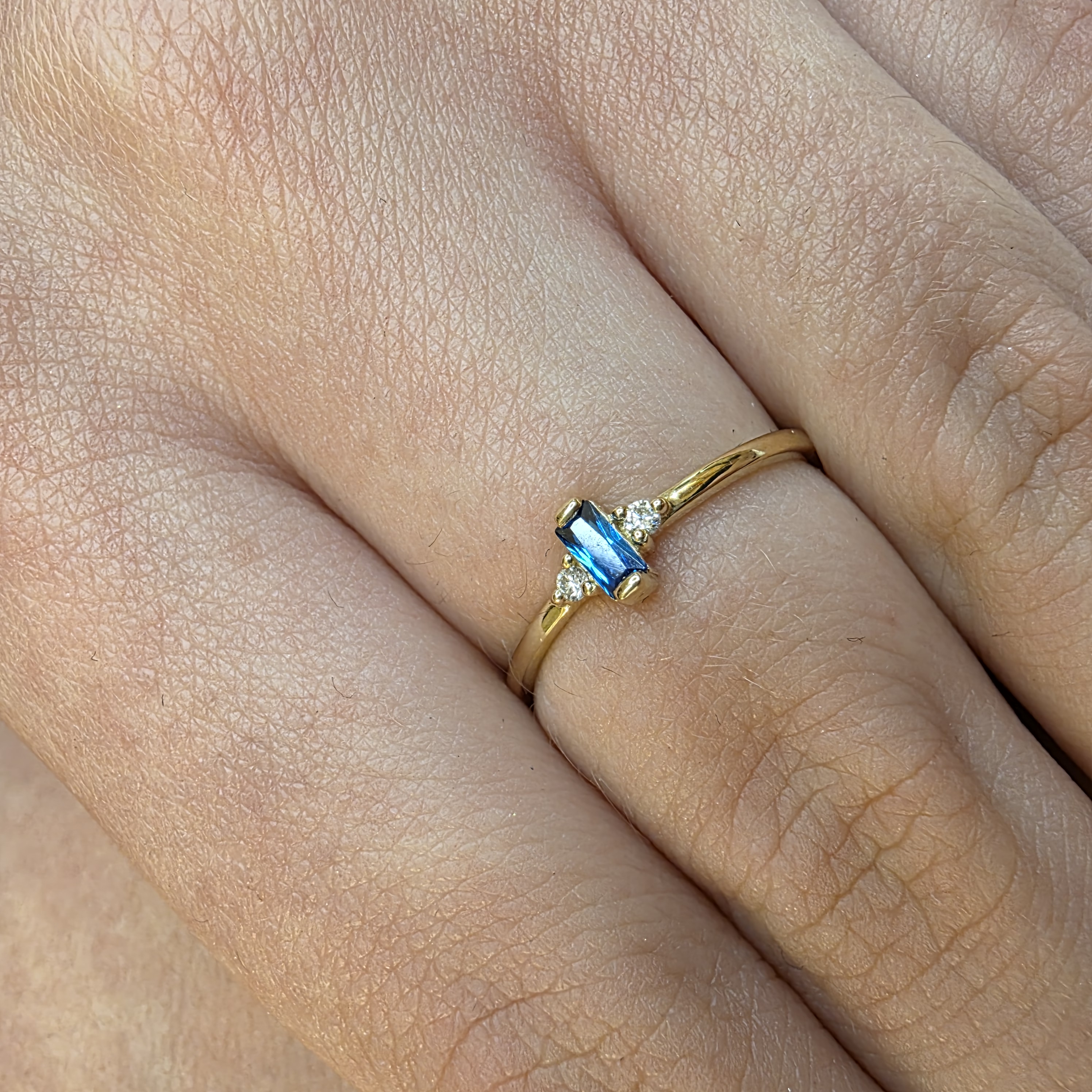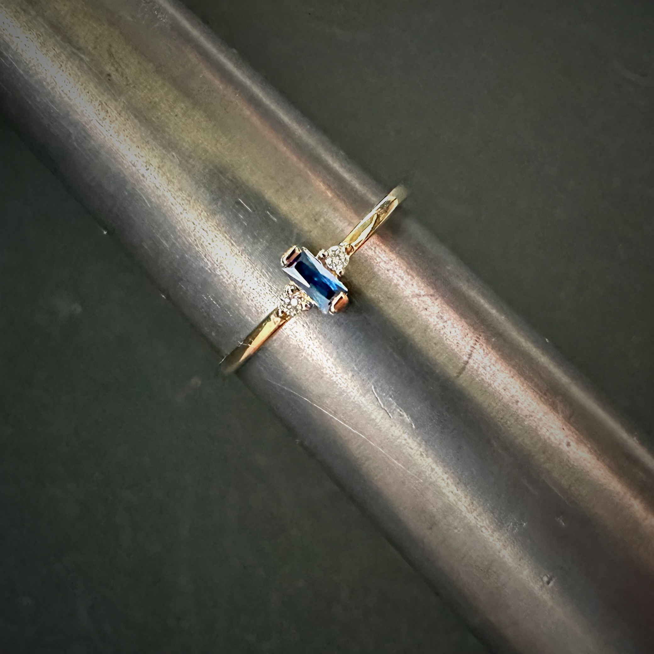 Szlif emerald o proporcjach 4 × 2 mm nadaje kamieniowi smukłą, elegancką formę. Jego prostokątna geometria podkreśla przejrzystość szafiru i sprawia, że wygląda bardzo harmonijnie mimo swoich delikatnych rozmiarów.